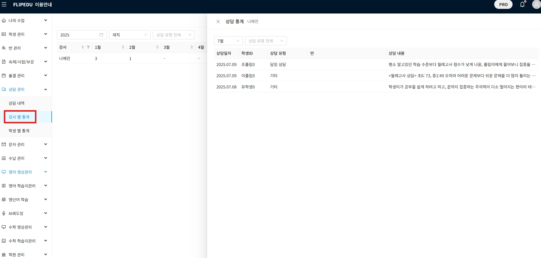 [상담 관리] - [강사 별 통계]탭에서 강사 별 상담 횟수를 확인할 수 있어요.