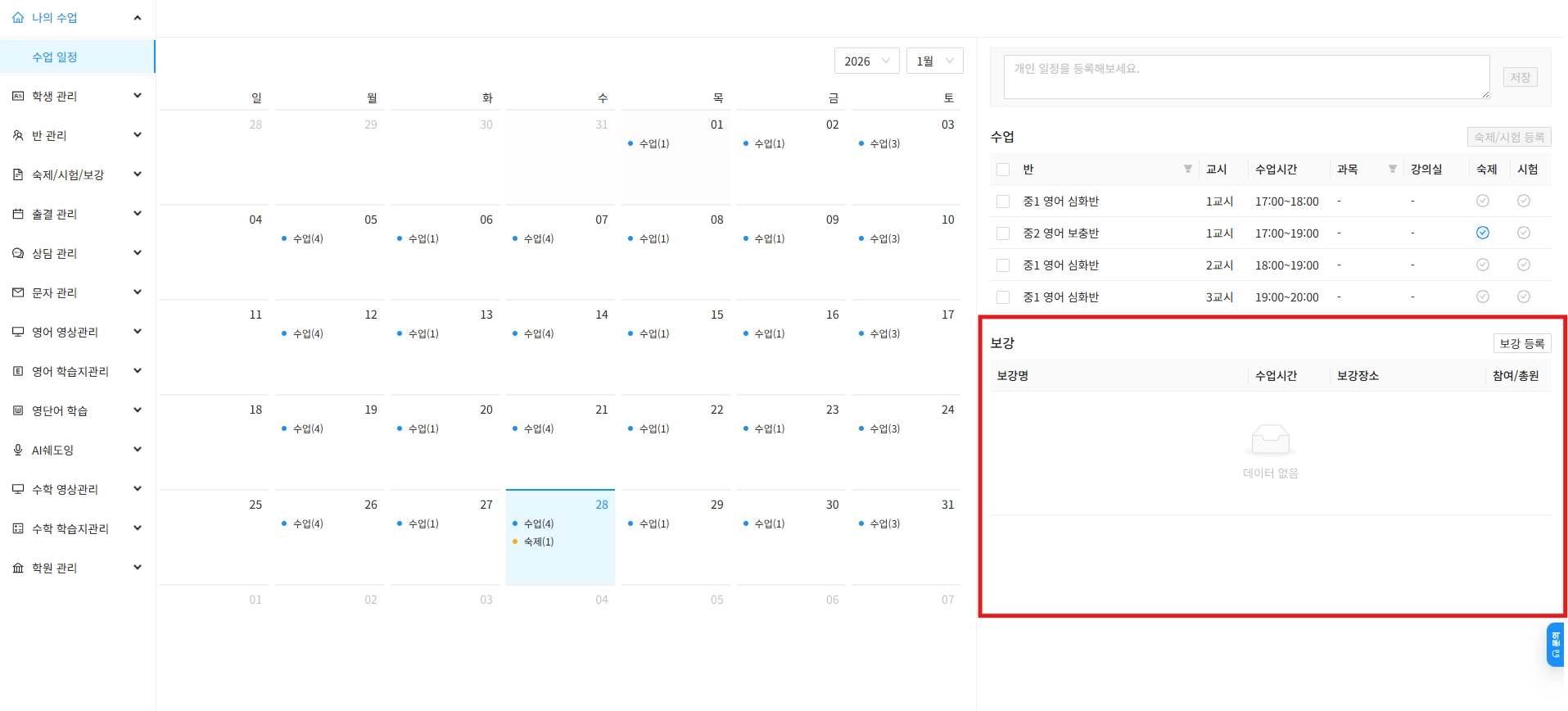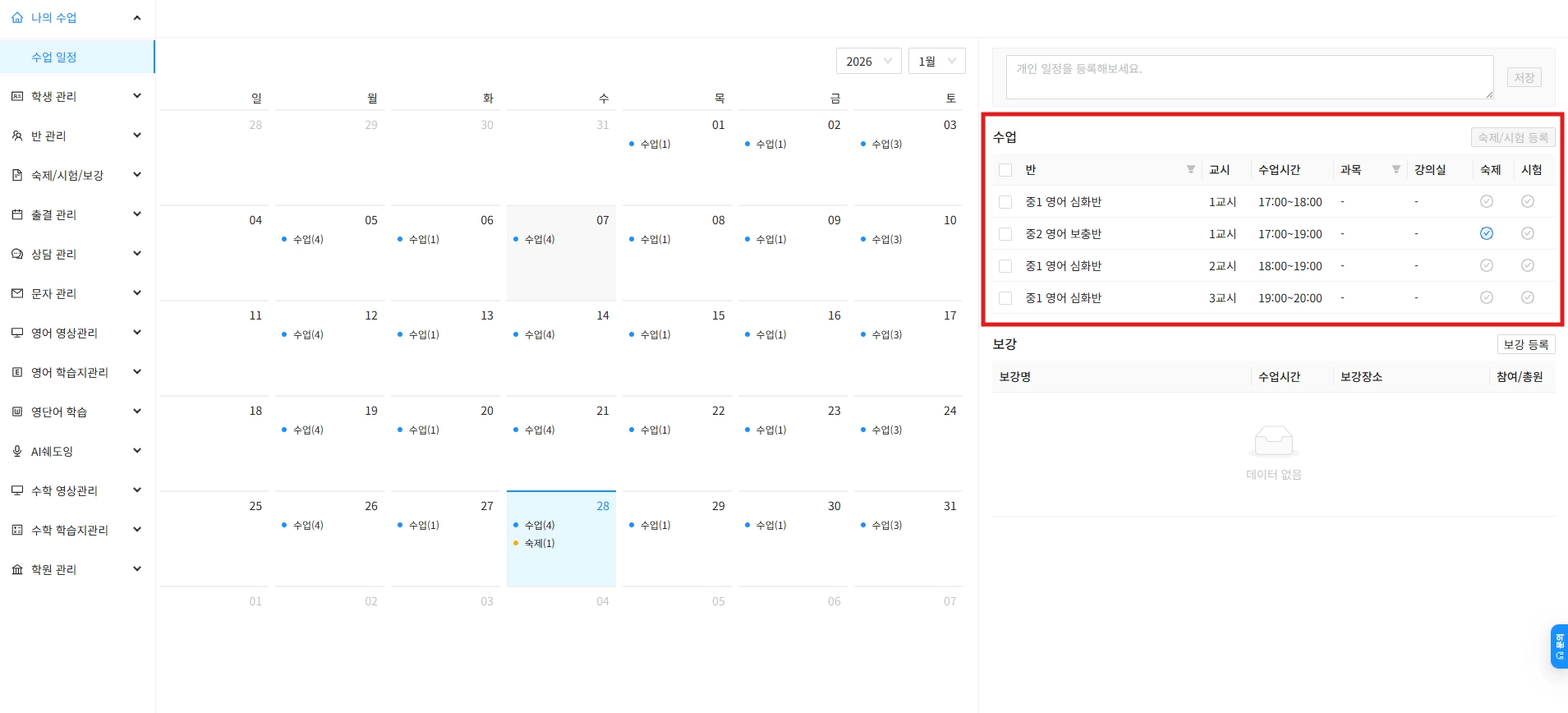 보강 등록 및 보강 일정 확인도 가능하답니다.