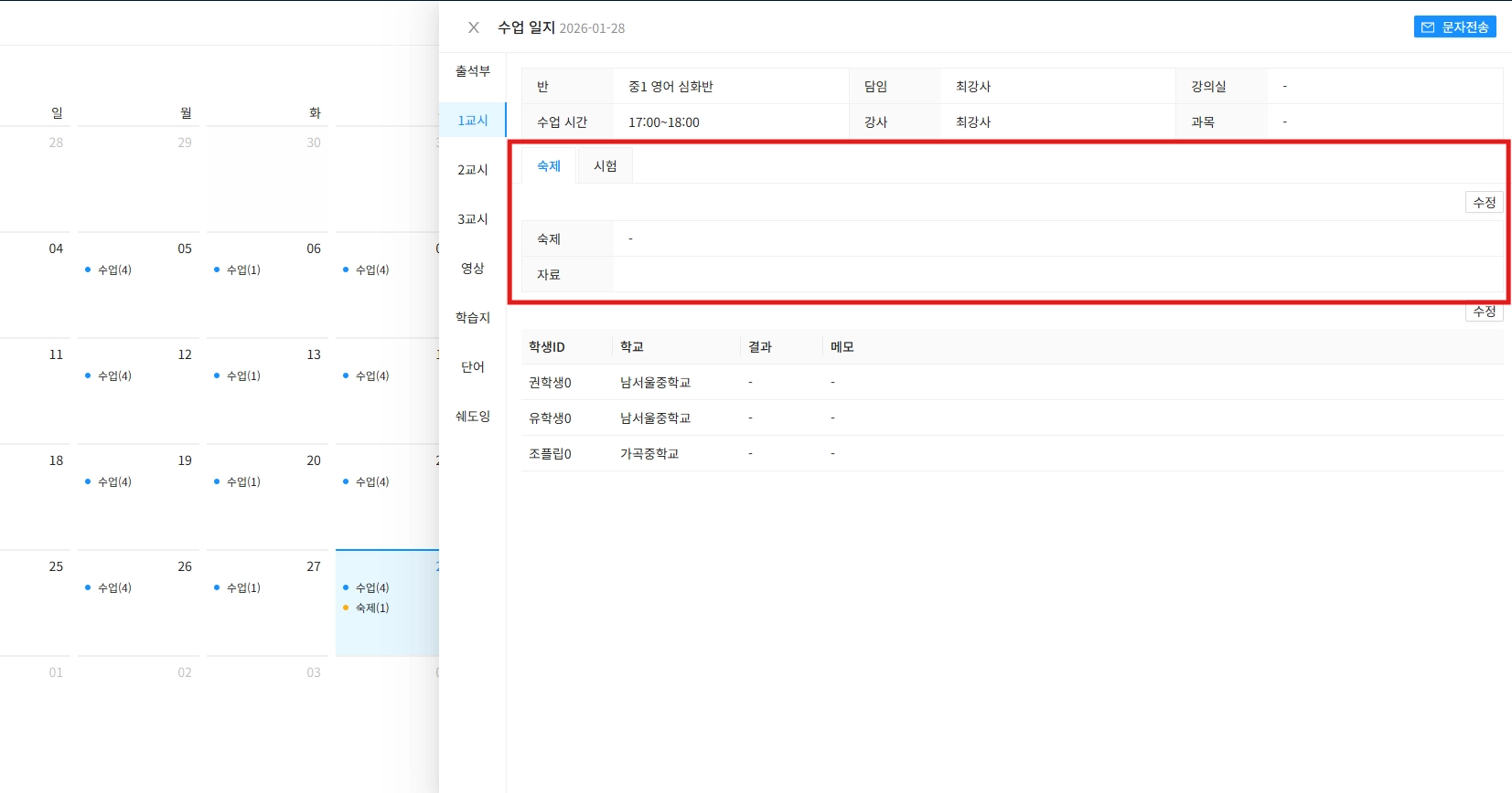 수업을 클릭하면, 바로 ‘수업 일지’가 떠서 숙제 및 시험 관리를 할 수 있어요.