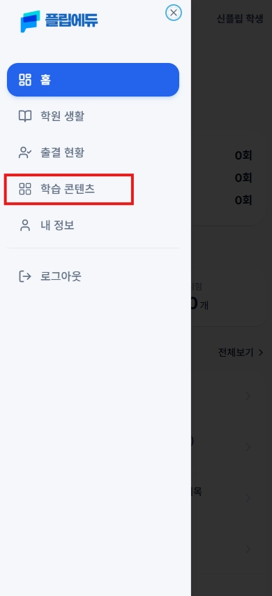 플립에듀 홈페이지 - ‘학생 로그인’으로 접속한 다음, [학습 콘텐츠]에 접속합니다.