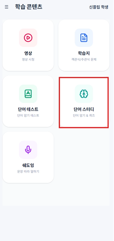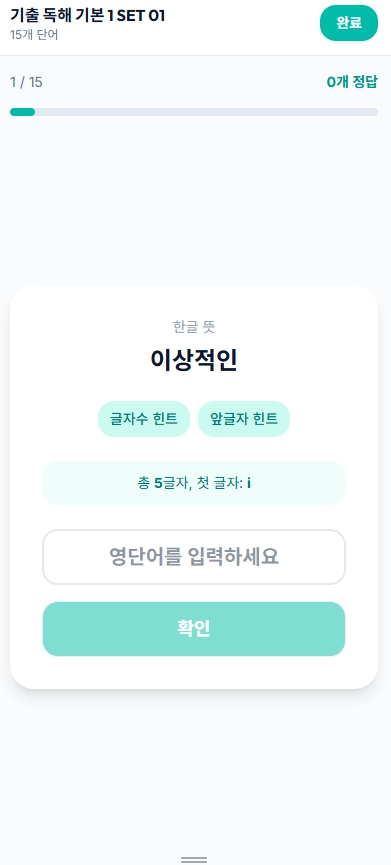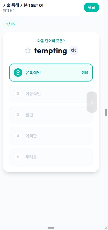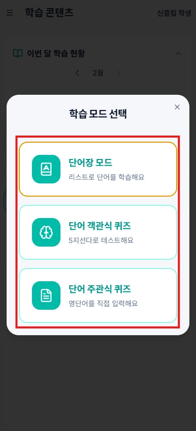 ‘단어장 모드’, ‘단어 객관식 퀴즈’, ‘단어 주관식 퀴즈’ 등 유형을 선택하여 학습합니다.