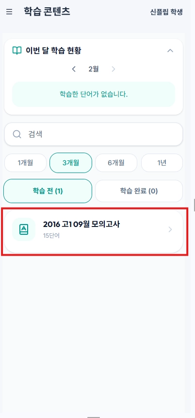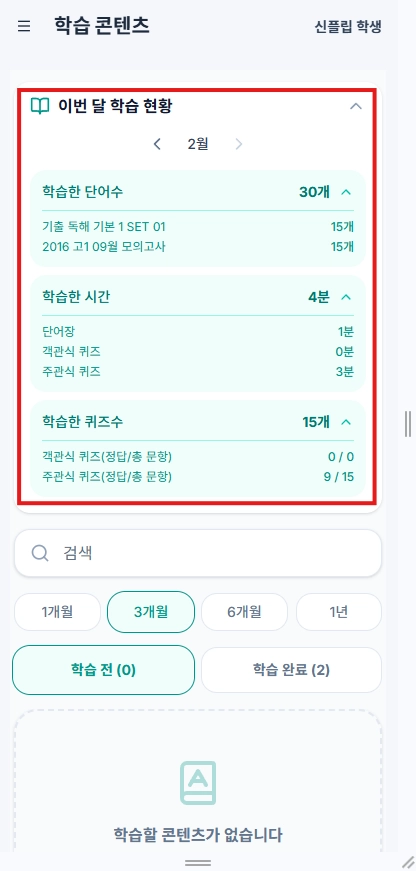 [학습 콘텐츠] - [단어 스터디]에 들어오면 화면 상단에서 이달의 단어 학습 이력을 한눈에 확인할 수 있습니다.