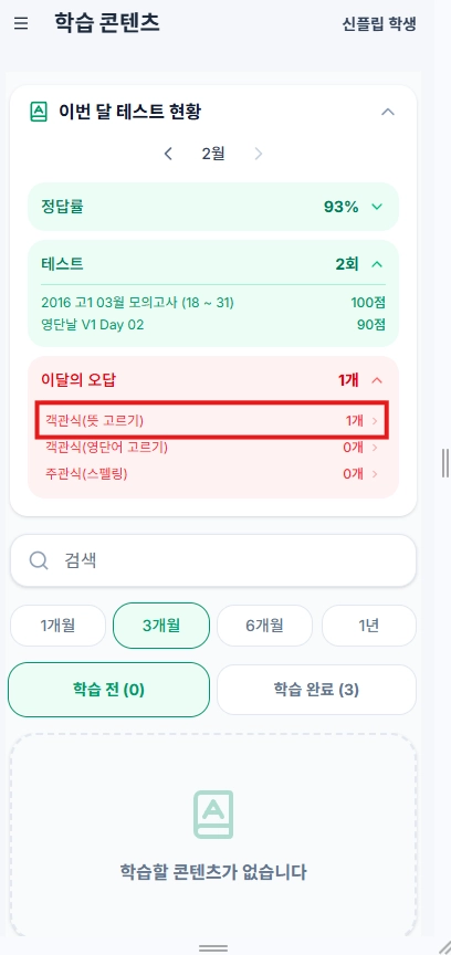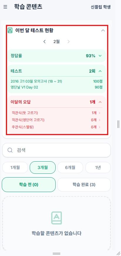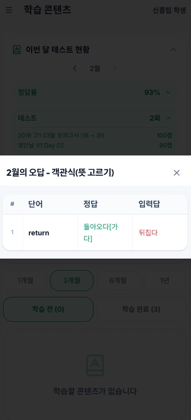[학습 콘텐츠] - [단어 테스트]에 접속하면 화면 상단에서 이달의 단어 테스트 결과를 한눈에 확인할 수 있습니다.