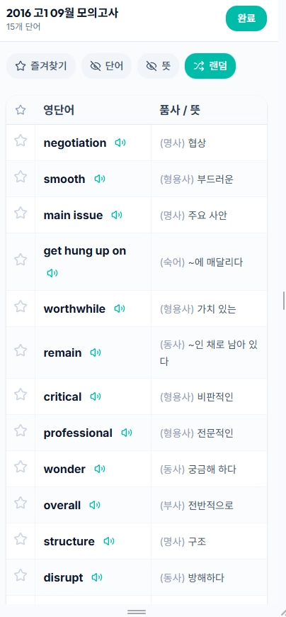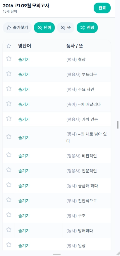 - 단어 즐겨찾기, 영단어 숨기기, 뜻 숨기기, 영단어 발음 듣기, 랜덤 순서로 확인하기 가능