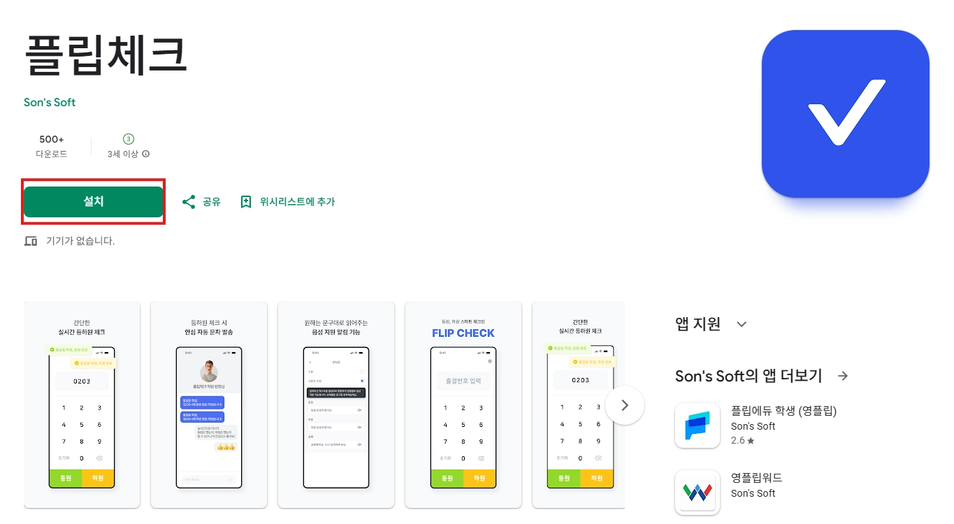 1. 출결용으로 사용하실 기기에서 출결관리 어플 [플립체크]를 다운로드 합니다.